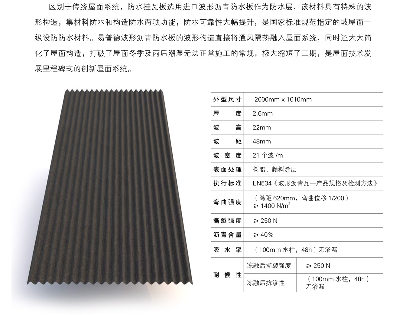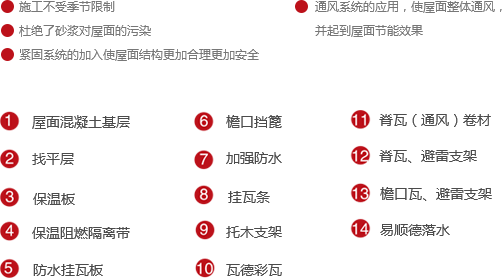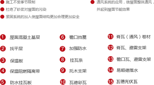借鑒歐洲坡屋面防水理念,將平面防水改為立體防水,采用新型防水板材料,將材料防水和構造防水于一身,配合屋面系統(tǒng)組件,實現全天候全干作業(yè)。節(jié)省了屋面各類保護層次,打破了屋面冬季及雨后陰濕無法施工的常規(guī),縮短了工期,提升系統(tǒng)安全性能。
